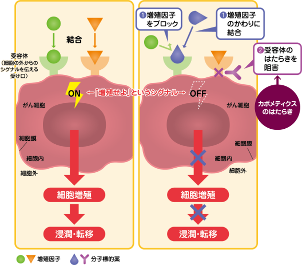 カボメティクスは、このVEGFRを阻害して「新生血管の形成」というシグナルの伝達をブロックします。