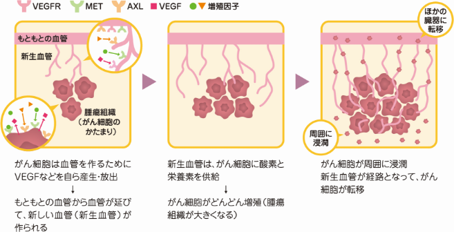 肝細胞がんでは、がん細胞がさかんにVEGFを放出し、多くの新生血管が形成されます。そうすると、がん細胞が活発に増殖できるようになり、周囲に浸潤したり、新生血管を通じて血管に入り込み、ほかの組織や臓器に転移したりするのです。さらに、肝細胞がんでは、同じく新生血管の形成にかかわるMETおよびAXLという分子が異常に活発になっていることがわかっています。