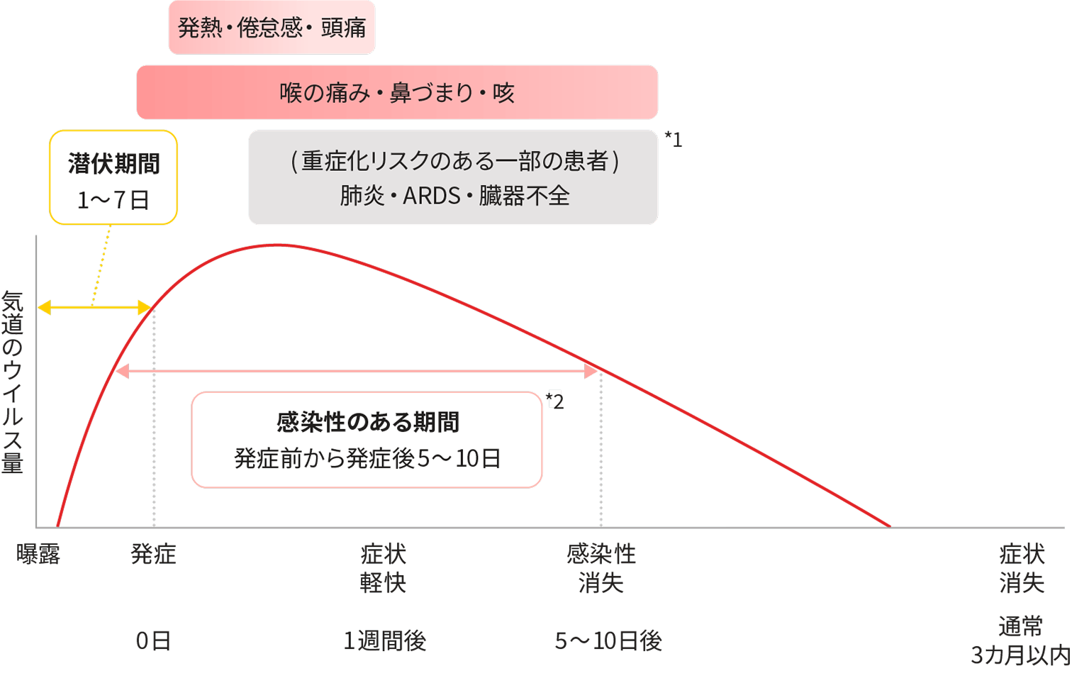 新型コロナウイルス感染症は、潜伏期間が1~7日(中央値2~3日)程度です。発症後は1週間ほどで回復してくることが多いですが、一部の感染者ではその後、状態が悪化することがあります。