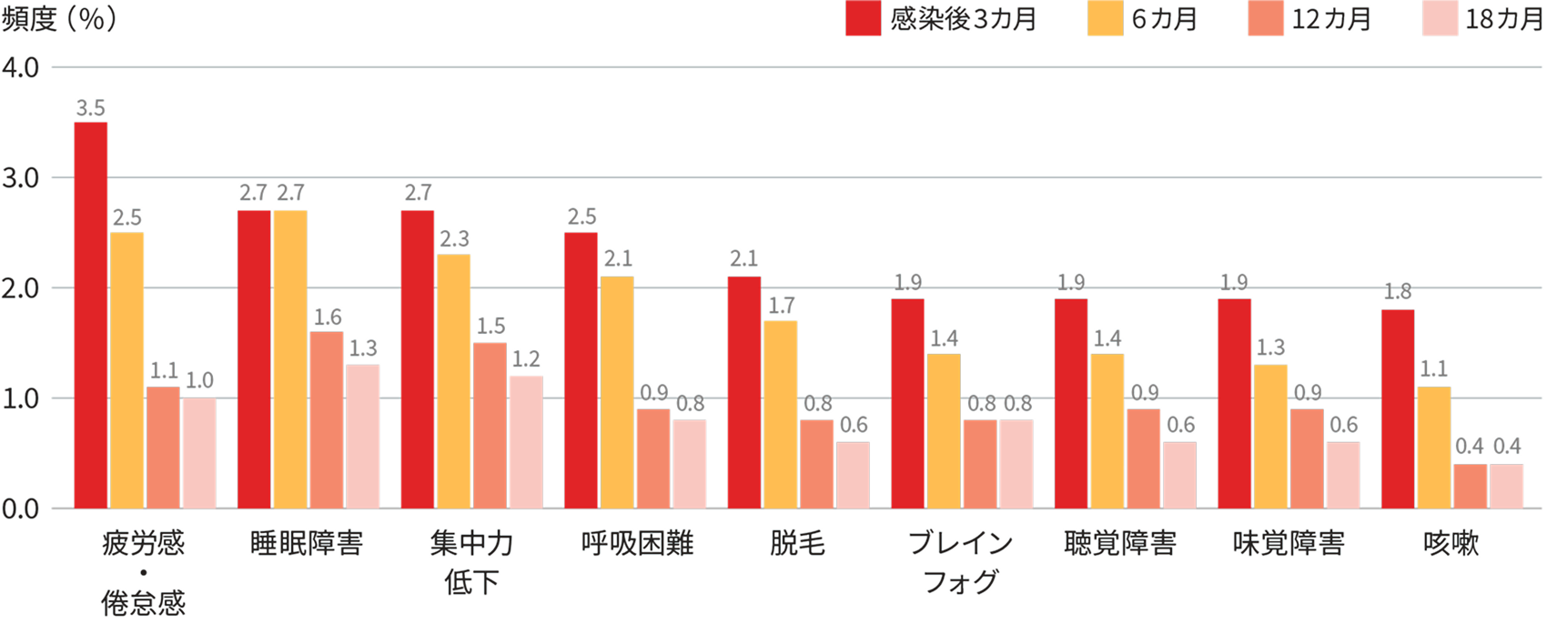 よくみられるのは、長引く疲労感・倦怠感や睡眠障害、集中力の低下、呼吸困難、さらには頭がぼんやりして上手く考えられない「ブレインフォグ(脳の霧)」といった症状です1)。こうした症状が、数カ月から数年にわたり続きます。