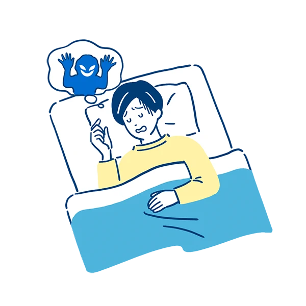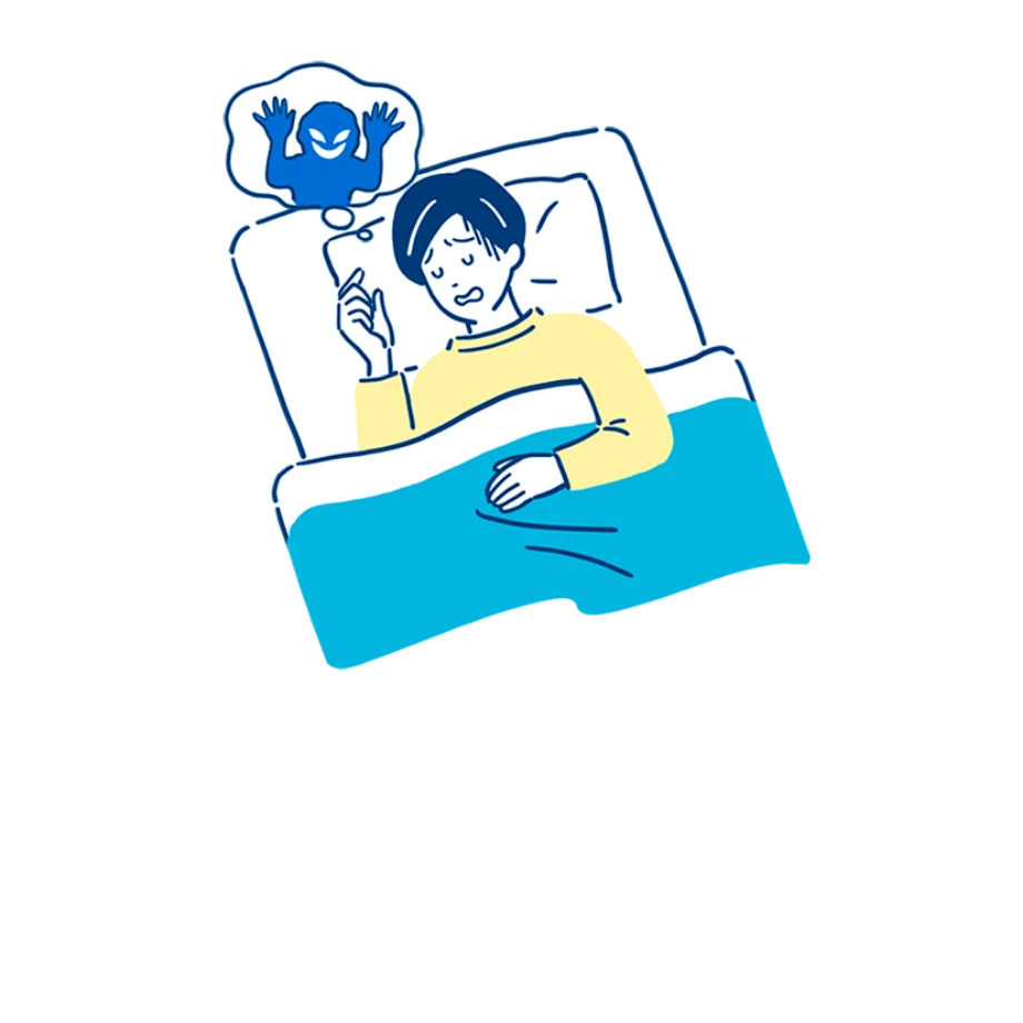 その他の症状として、笑ったときなどに体の力が抜ける(情動脱力発作:カタプレキシー)、眠りに入るときにみられる幻覚(入眠時幻覚)、金縛りが起こる(睡眠麻痺)、夜ぐっすりと眠れない(夜間睡眠障害)などがあります4-6)。初期症状としては、日中の強い眠気、睡眠発作などが起こりやすいといわれています。